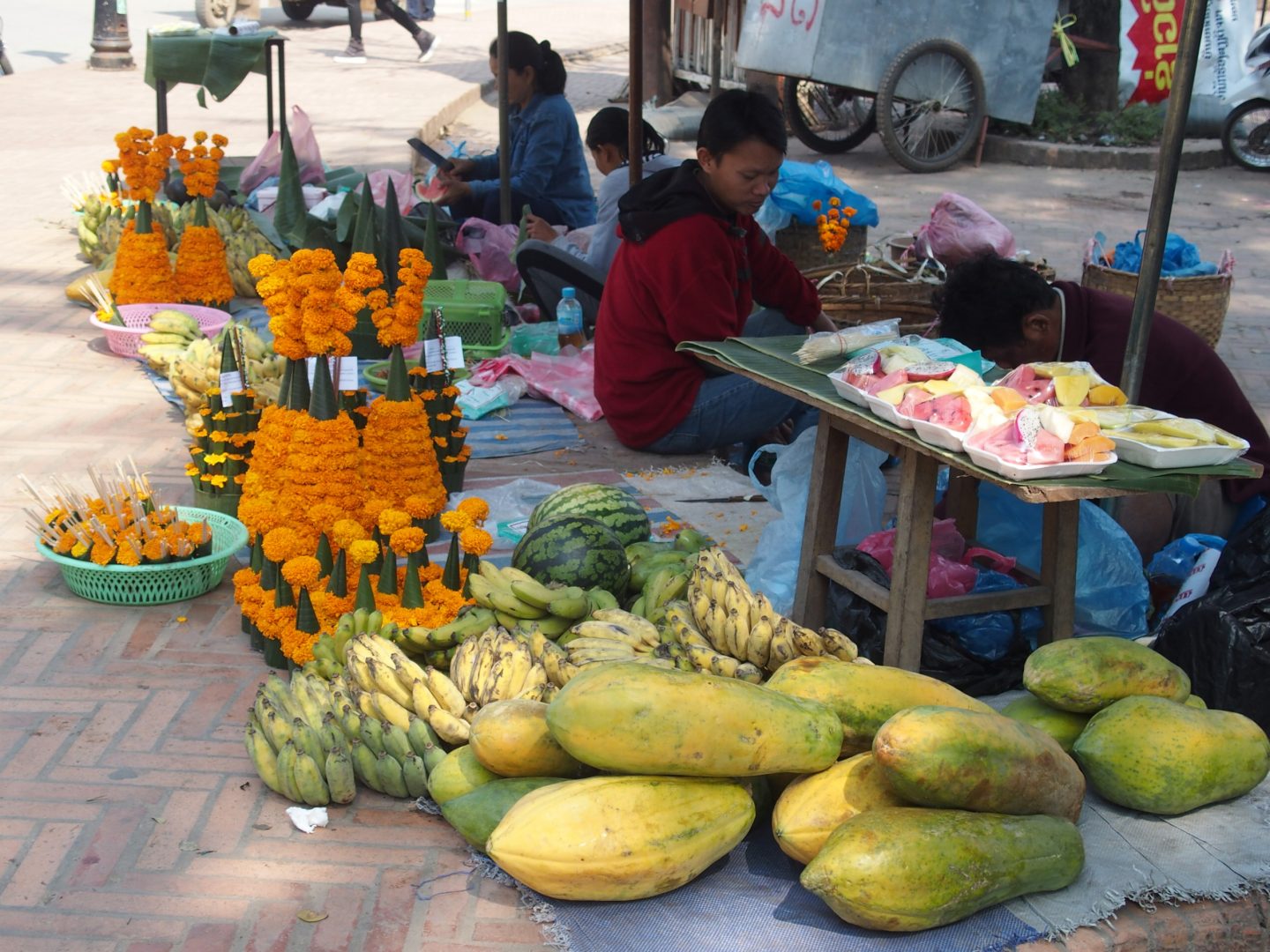 La matinée commence par la visite du Phosy market, situé en dehors du centre de Luang Prabang, sur Phothisarath road. Un grand marché de producteurs, comme je les aime, fréquenté par des clients locaux et pratiquement pas de touristes.