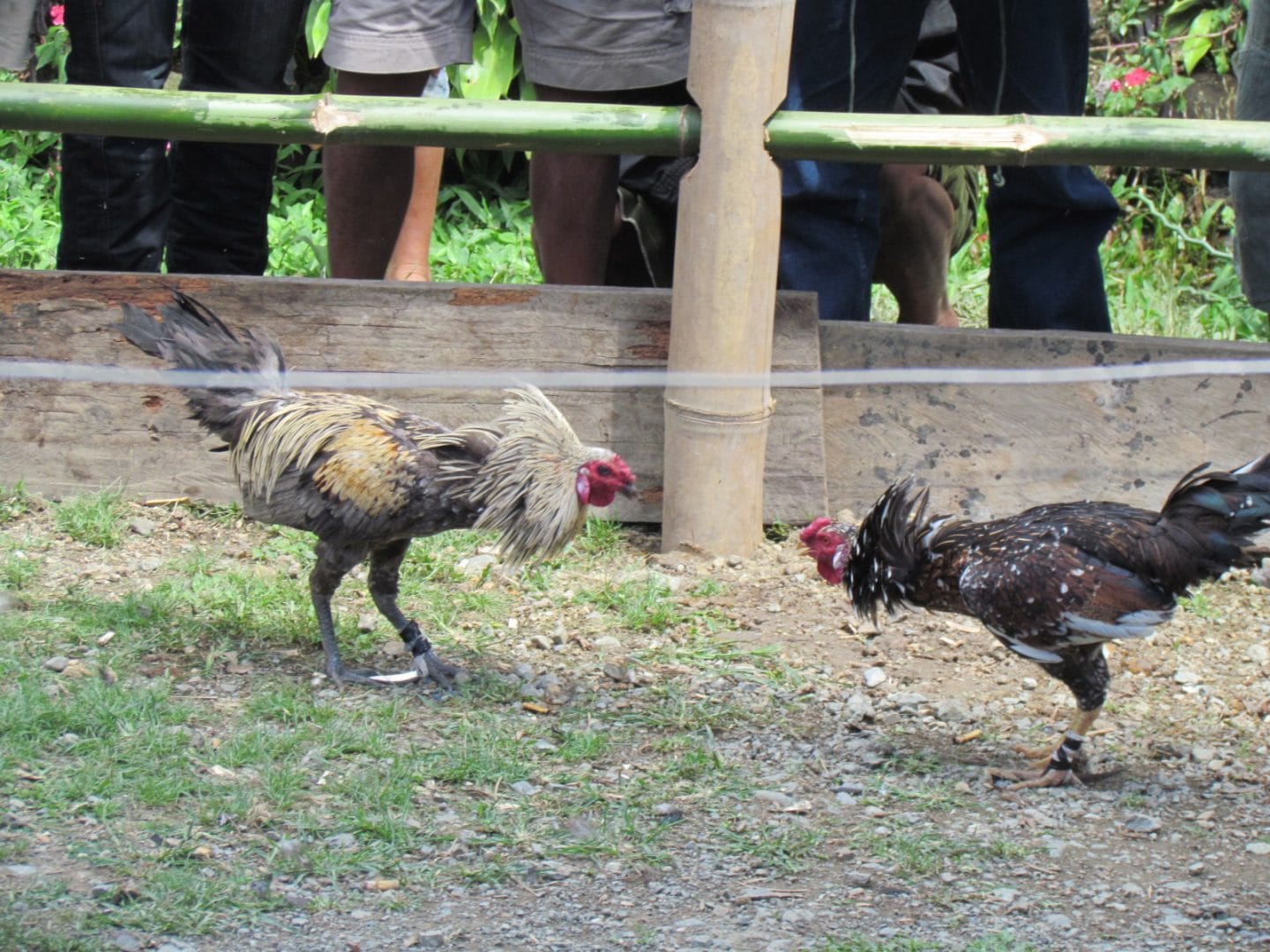 Les coqs sont attachés en attendant le combat. Les propriétaires des coqs entaillent à la lame de rasoir les mollets des coqs pour les rendre agressifs. Lorsque la cloche sonne le début du combat, les propriétaires jettent les coqs l'un contre l'autre. A ce moment-là, le combat peut durer quelques secondes ou bien de longues minutes.