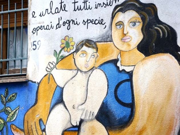 A l’occasion du 30ème anniversaire de la lutte partisane contre l’oppression nazi-fasciste et de la libération, des enseignants de la ville eurent l’idée de célébrer l’événement à leur manière, en collant dans le village des affiches illustrées de slogans. Leur volonté était d’impliquer les élèves dans la manifestation et d’en appeler à la mémoire collective des villageois. Le support papier étant trop éphémère, il a été décidé de poursuivre l’expérience en peignant directement sur les murs de la ville.