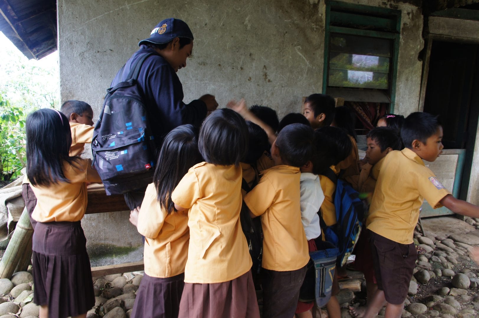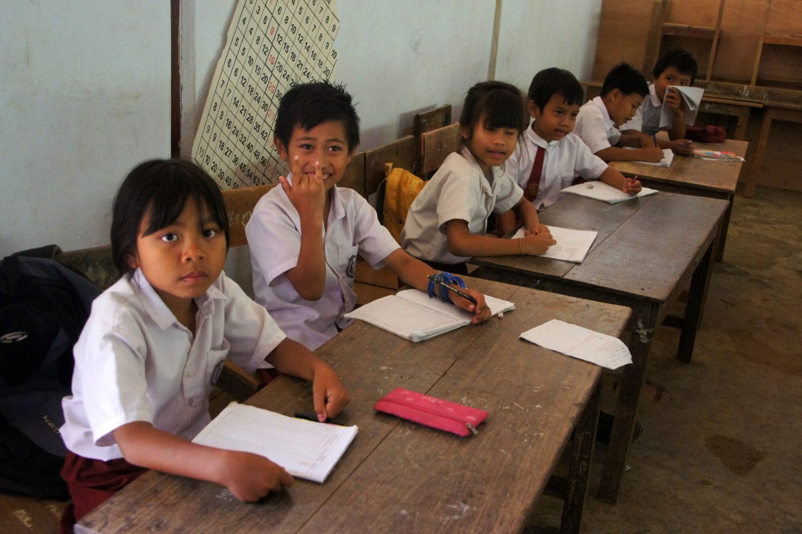 Autre école le lendemain où nous rencontrons les enfants à l'extérieur de leur salle de classe. Eko avait des "goulah-goulah" (bonbons) plein les poches et commence la distribution à des enfants très heureux !