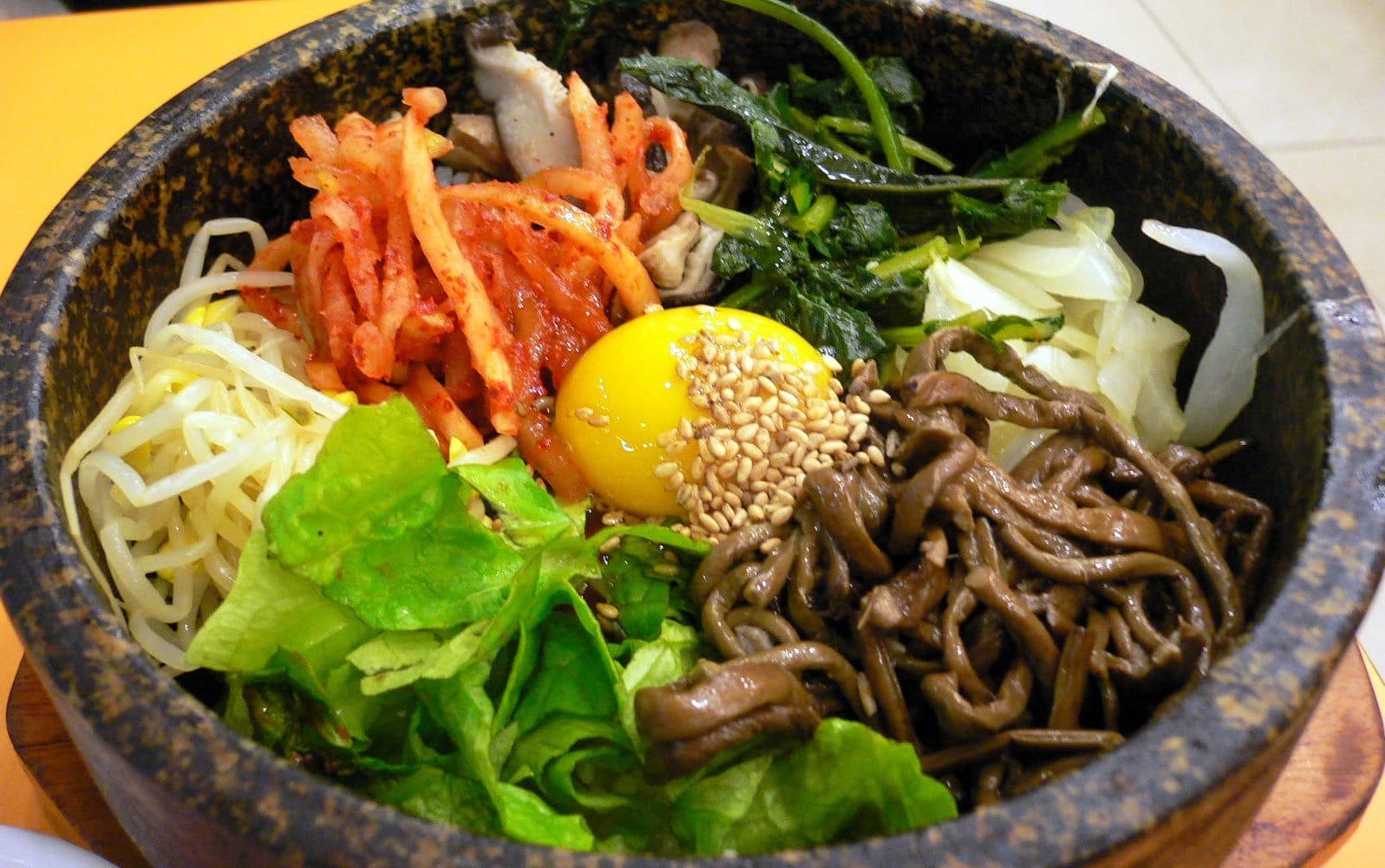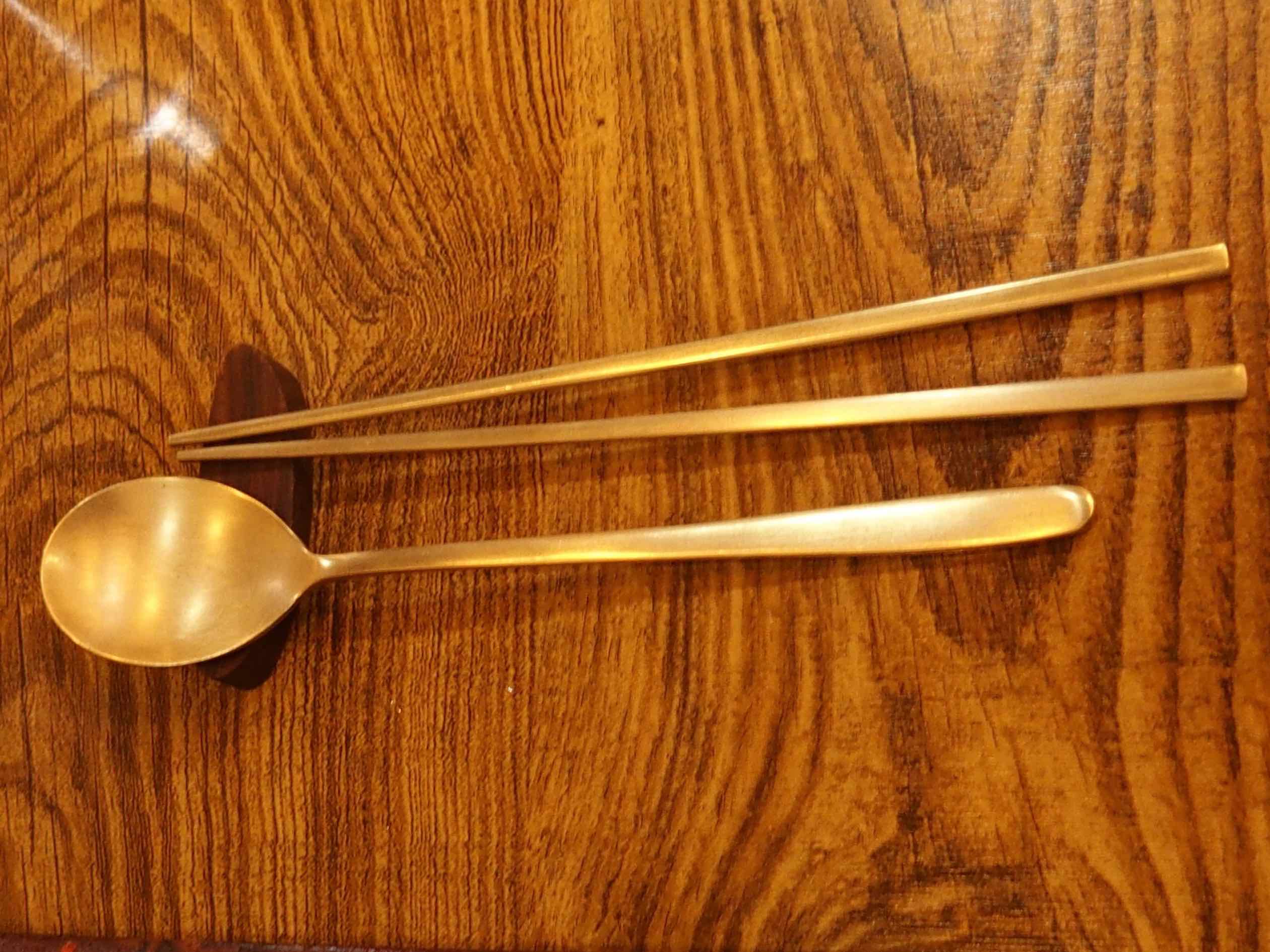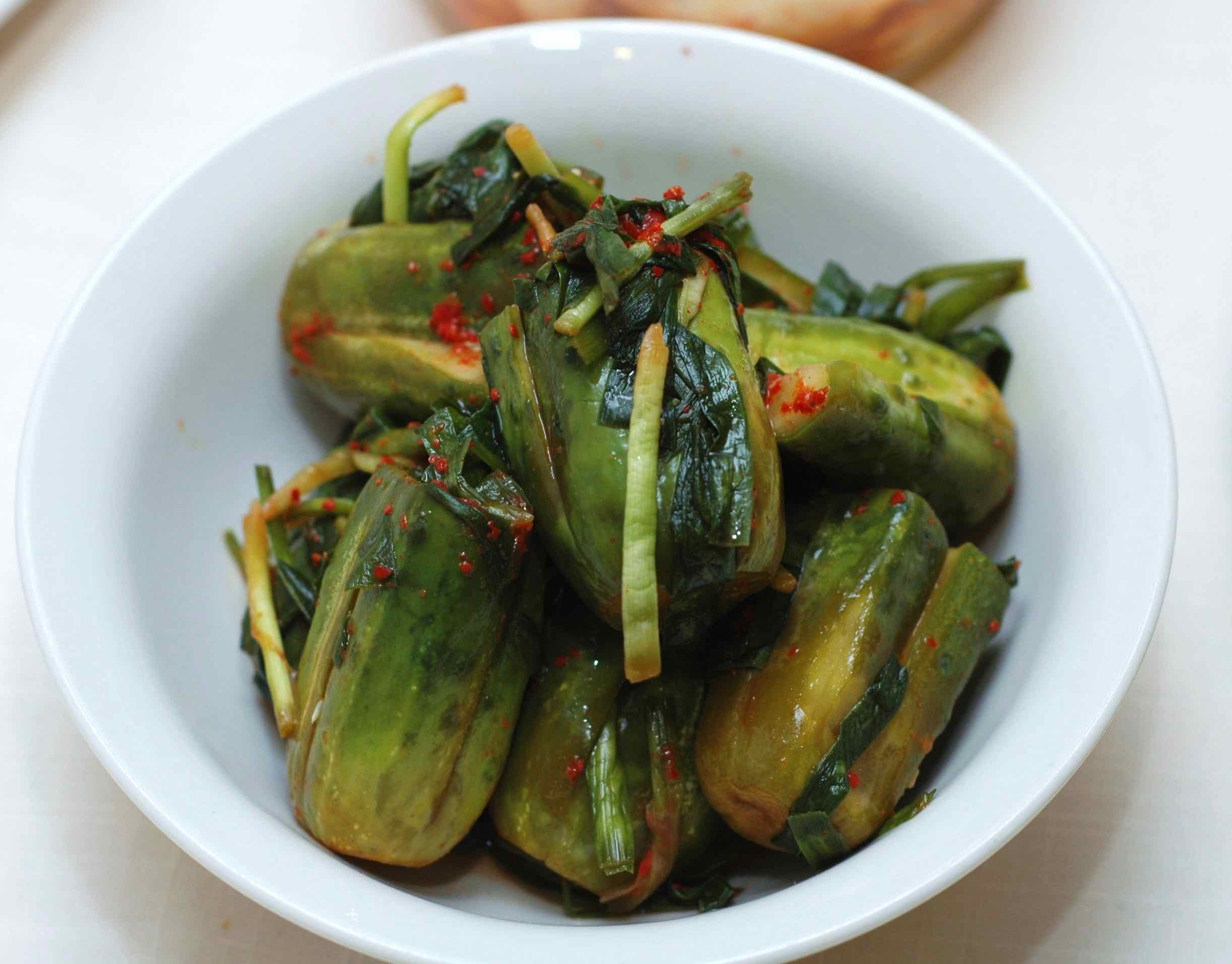 Les légumes et les soupes sont également très présents dans la cuisine coréenne. A côté du riz et de la soupe à chaque repas, on vous servira un plat incontournable, symbole de la gastronomie coréenne, le kimchi, qui peut être préparé avec différents légumes fermentés. Pas de repas sans kimchi ! Les épices sont également très présentes dans la cuisine coréenne. On retrouve bien entendu du piment rouge et du sésame sous forme d'huile dans le kimchi ou le gochujang, une sauce très piquante. Dans un repas Coréen, tout est servi en même temps au centre de la table et chacun puise dans les plats d'accompagnements à sa guise. On utilise une grande cuillère pour manger le riz et la soupe et des baguettes en métal pour les autres ingrédients.