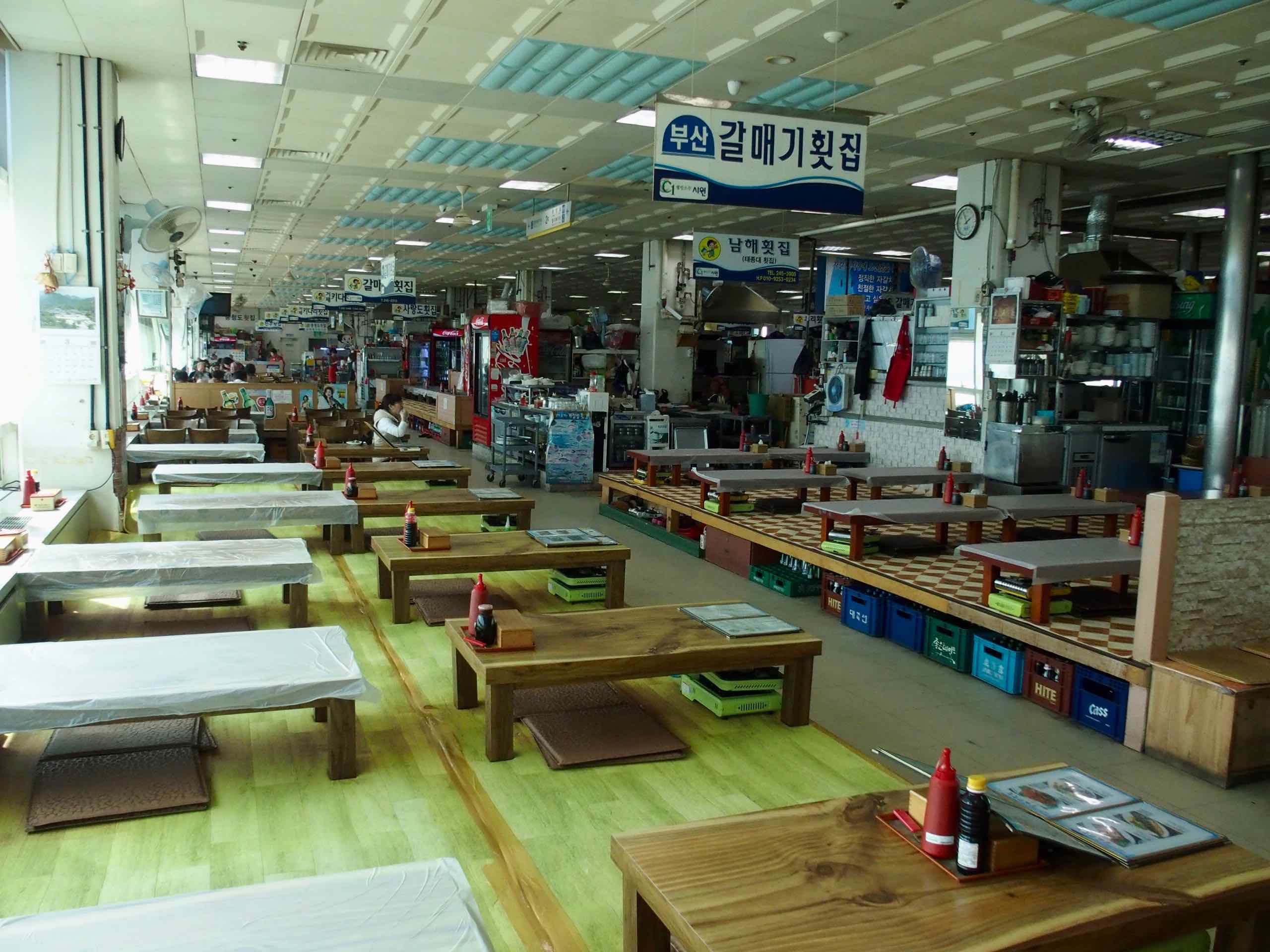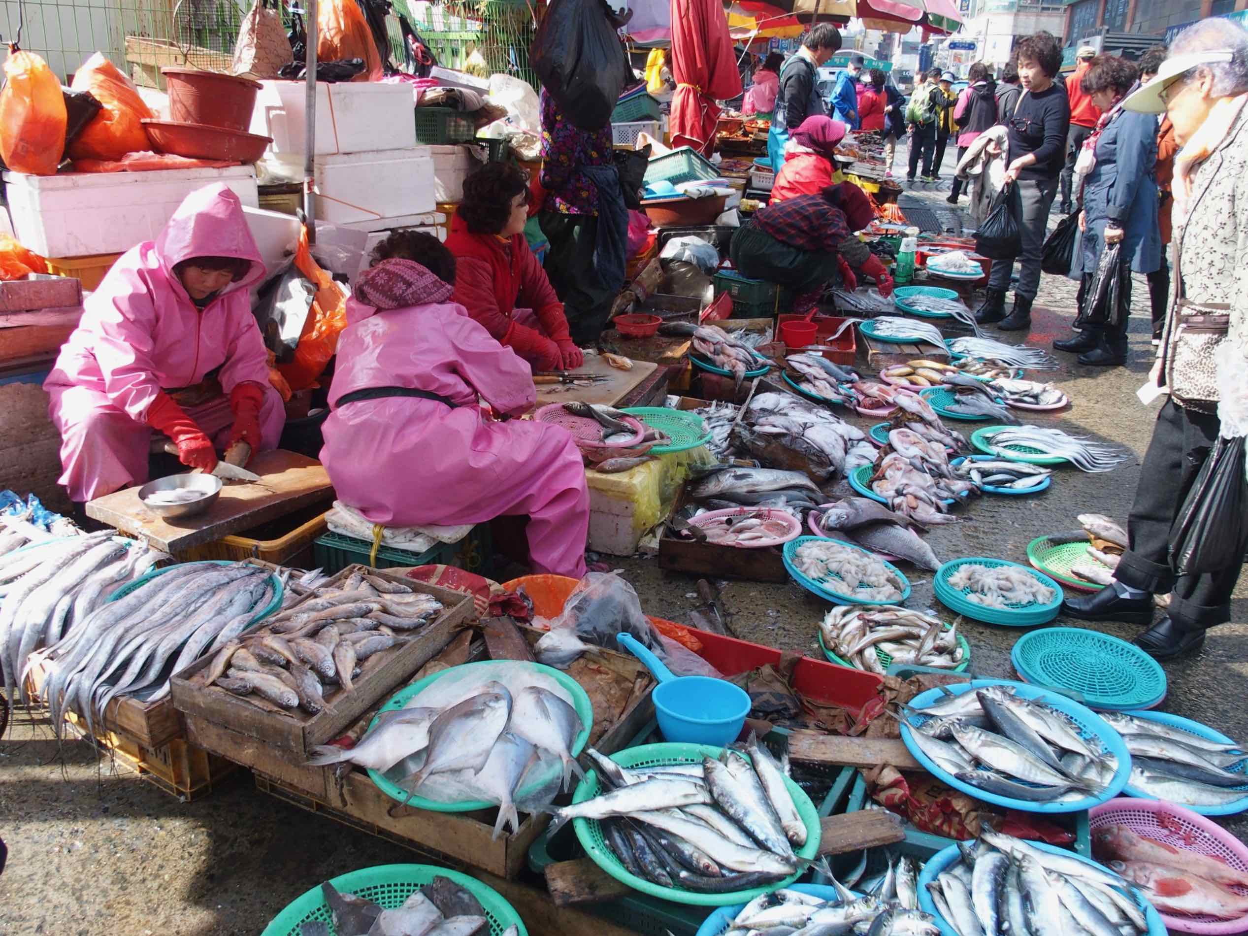 Le spectaculaire marché Jagalchi, situé sur le port de Busan, la seconde ville de Corée du Sud. C'est le plus grand marché de fruits de mer du pays où les "Ajummas" sont indispensables et très respectées. Ce sont des femmes d'un certain âge omniprésentes sur le marché coiffées de leur fameuse visière ! Après avoir observé avec intérêt leur travail, J'ai déjeuné dans l'un des très nombreux restaurants qui se trouvent au 1er étage.