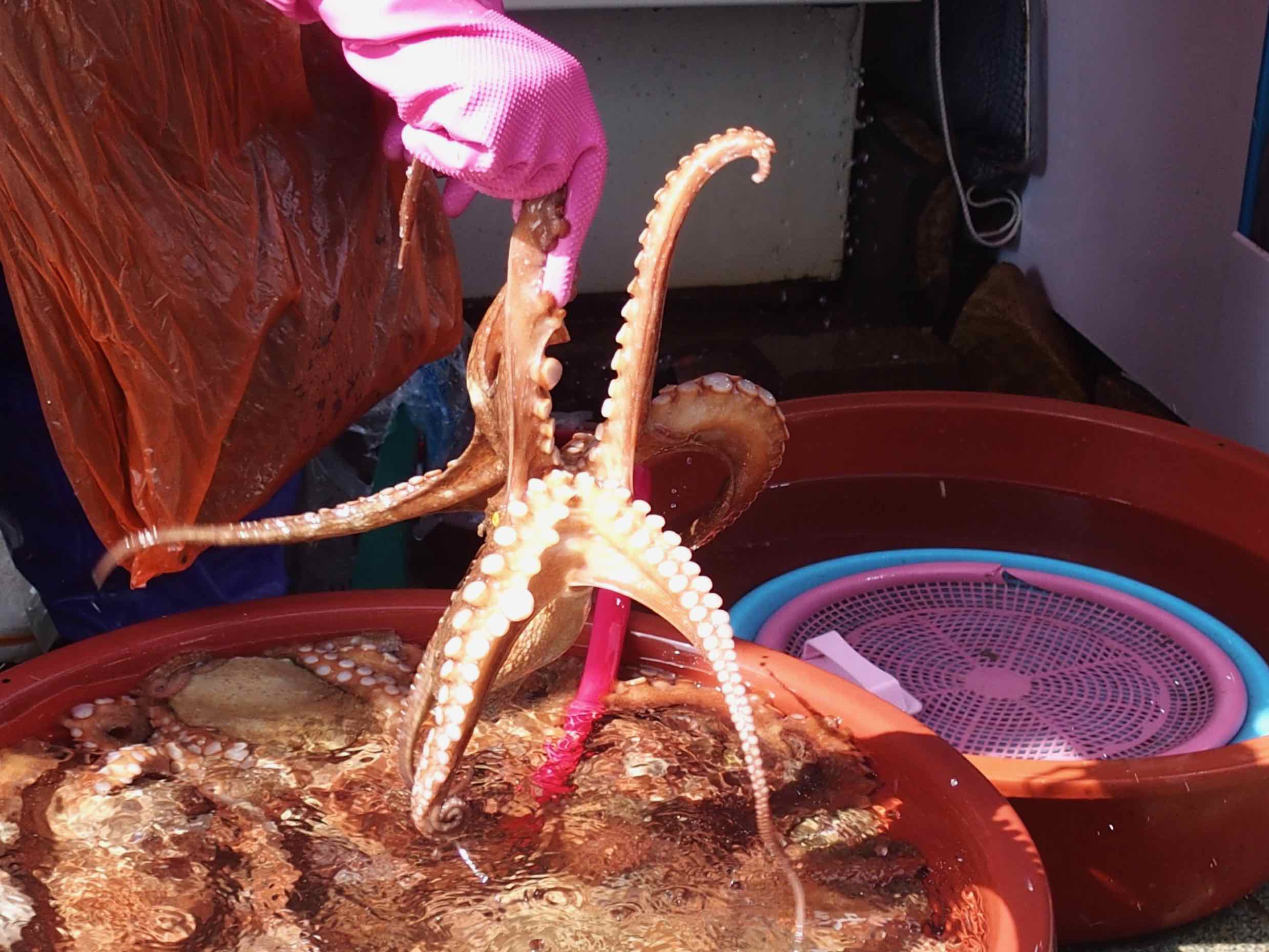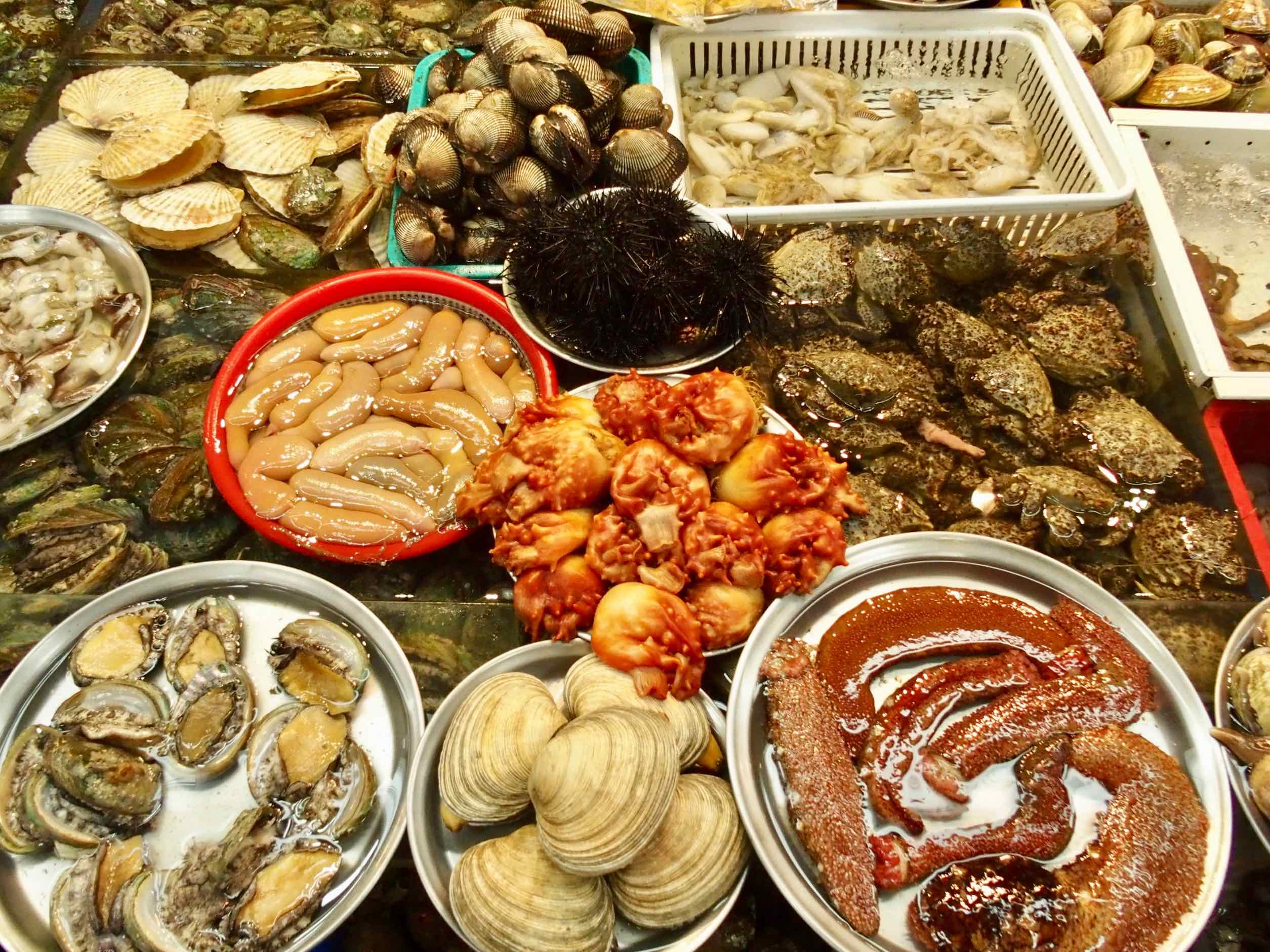 La Corée du Sud est une péninsule entourée de trois mers : la mer jaune, la mer de Chine et la mer du Japon. Autant vous dire que l'on retrouve beaucoup de poissons, crustacés et fruits de mer sur les marchés et dans la cuisine coréenne ! Certains d'entre eux ont un air de famille avec ceux que je consomme en Bretagne, mais dont d'autres me sont apparus réellement inconnus et surprenants. En Corée, on les consomme généralement crus, grillés ou fermentés, comme les légumes. Dans le sud de la Corée et sur l'île de Jeju, j'ai également vu une grande variété d'algues comestibles utilisés dans la cuisine coréenne.