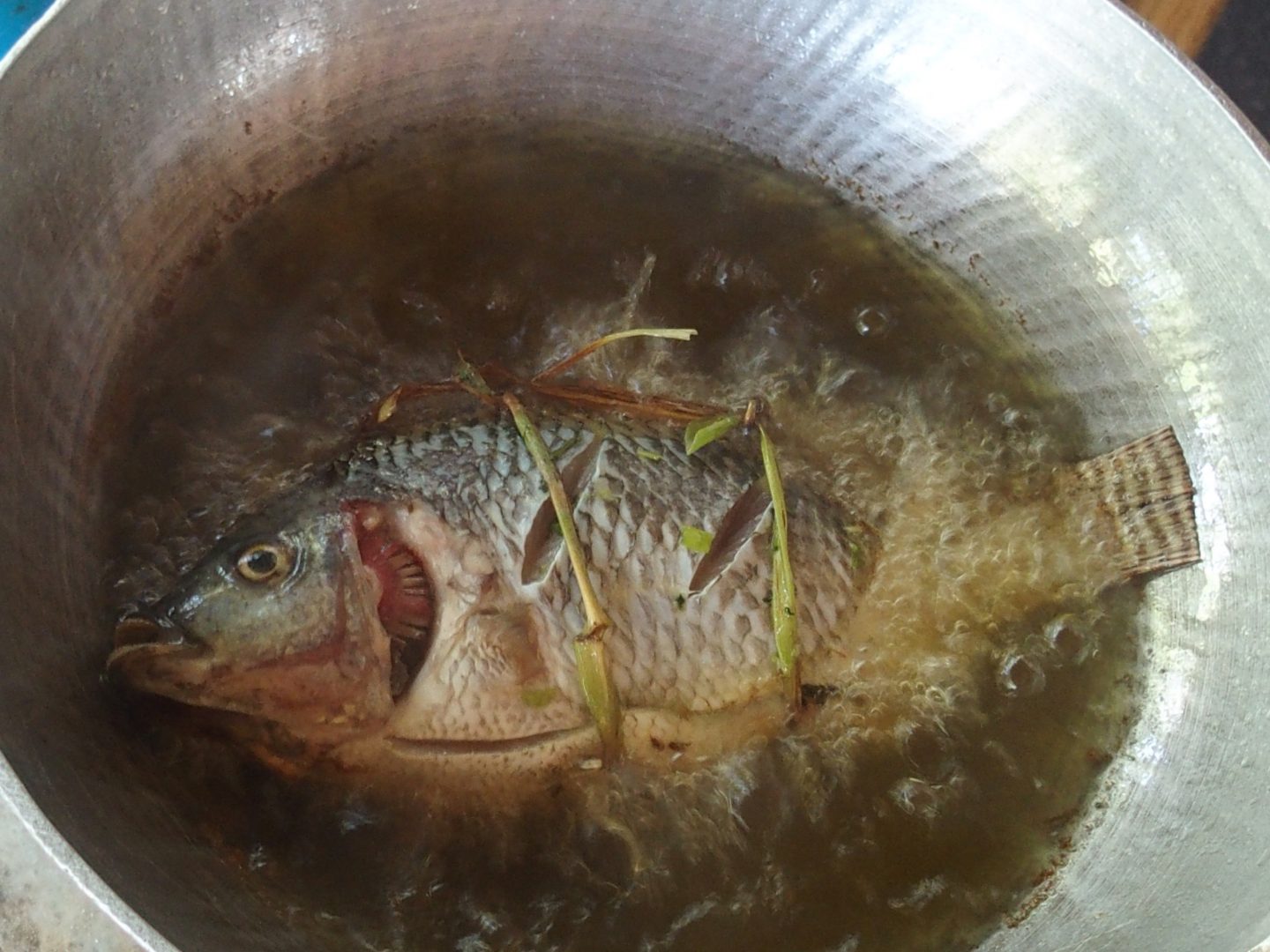 Il était quasiment impossible de cuisiner un autre poisson que celui-ci qui foisonne dans le célèbre lac Inle ! Le Tilapia est un poisson exotique à la la chair de couleur pâle et au goût pas très prononcé. Sue, la cuisinière, propriétaire des lieux et dynamique actrice au profit de la population locale a fait griller le Tilapia après l’avoir fait mariner dans une préparation salée et de l’accompagner d’une sauce épicée parfumée à la coriandre.